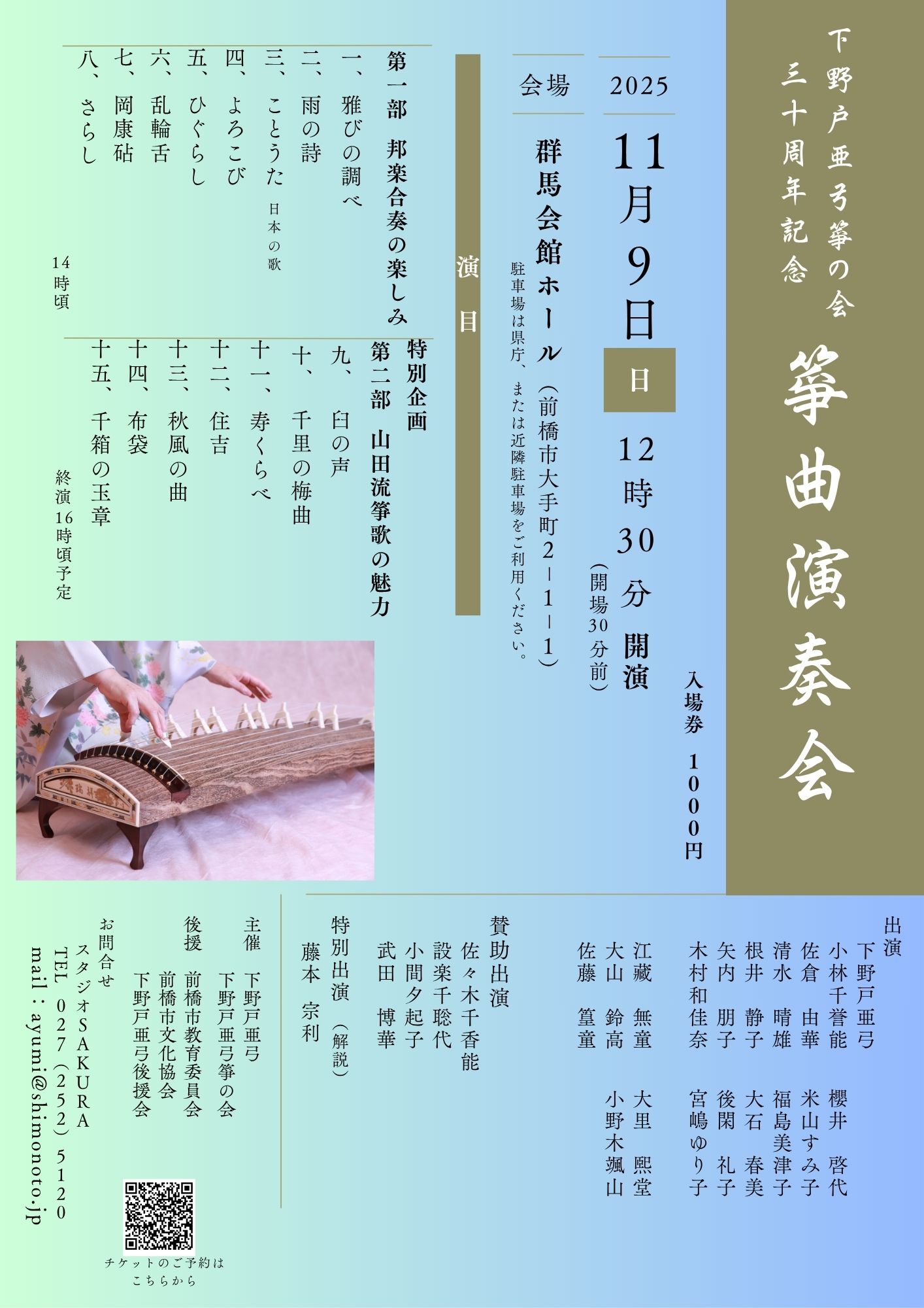 なんと私の主宰する「下野戸亜弓箏の会」が30周年を迎えましたので、今回は30周年記念として、企画プログラムによる箏曲演奏会を開催します。